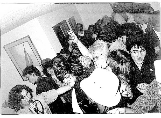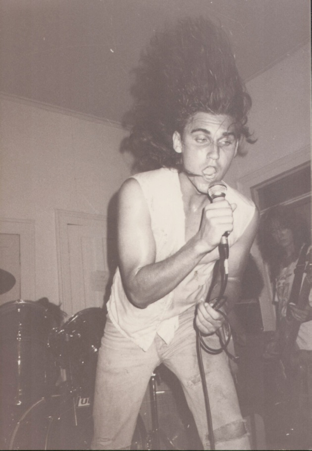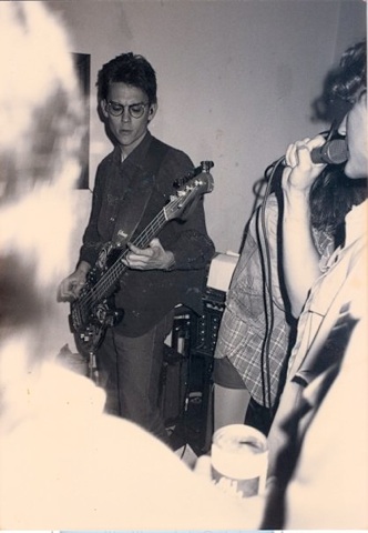 One of the house parties we played. Officer Friendly (which was named Enema 4 for about a week) cashed in on Psychic Violents’ huge popularity, AND on the multi-talented Sam Gough’s desire to play drums, AND on Steve Antczak’s long-slumbering desire to sing songs. Mike was learning to play guitar, and I was (continuing) to learn to play bass. Somewhere there is audio evidence of the handful (well, three fingers) of shows we played. The picture above is from a party where someone pissed on the drum set. This was a drunken commentary on how good or bad (or possibly a sublime combination of both) we were. When we ran out of our limited set list (which featured that barn-burner, “White Rabbit”, which I learned while playing with Mike Schafer), we just played the set list again. “Killing Time”, Steve’s ode to the Gainesville lifestyle, was featured in my, Hawk (Jim Bassett) and Steve’s movie TWISTED ISSUES, but never made the cut to the 90-minute soundtrack cassette. It should be noted that the gal standing behind me in the photo above is Sam Gough’s girlfriend (later wife) Vicki, who replaced me on bass when I left for NYC in Spring 1988. She can be seen, along with Steve’s wild mane, in the photo below.
